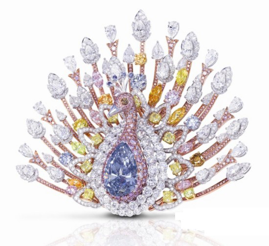 Graff最具代表性的一件珠宝作品就是这件孔雀胸针,这枚精美绝伦的胸针可谓旷世之作,高约10厘米,合共镶嵌120.81克拉尖端美钻,价值1亿美元。胸针中心是一颗重20.02克拉的深彩蓝色梨形钻石,人间罕有。正中的方位和淡雅的颜色,天然成为最高雅耀眼的焦点。