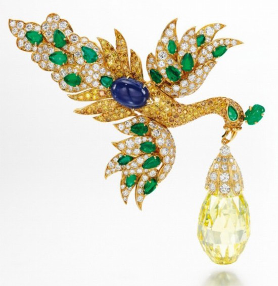 梵克雅宝这件冷艳世人的胸针于1971年创作完结,这枚疯狂叼着的是瓦拉斯卡皮奥赖特型钻石,这是一枚精美绝伦的泪滴形切开黄钻,重达96.62克拉,此前一直是二十世纪30年代波兰歌剧女高音与珠宝鉴赏家嘎纳·瓦拉斯卡(Ganna Walska)的收藏之物。