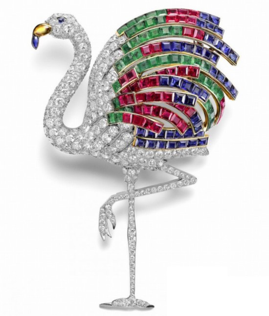 卡地亚曾在1940年为温莎公爵夫人制作了一枚构思精巧的火烈鸟胸针,这也令这个珠宝品牌于火烈鸟元素结下不解之缘,2010年这枚胸针在苏富比拍卖,拍出172英镑高价。