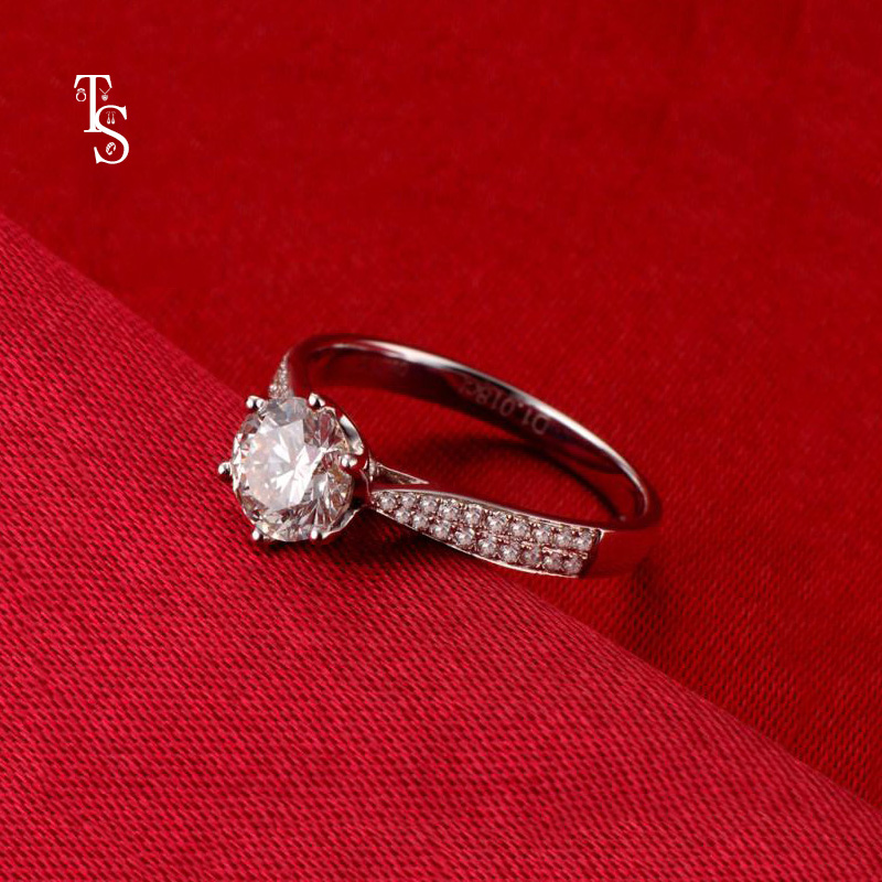 如果是小户型的住户应该都明白一个道理,那就是在小房间的墙面上安装上一面镜子,镜子可以反射四周的物体,造成视觉上的错觉,感觉房间变大了。同理可得,用白色的戒托也能起到同样的效果,白色戒托的明亮纯净可以像镜子一样反射钻石的透明和亮泽。