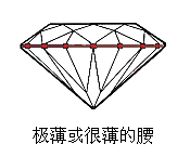3)腰部厚度:一颗明亮型(圆型)钻石的理想腰部厚度应该介于《薄》到《微厚》之间。即腰厚应该是《薄》,《适中》,《微厚》或是这三个的一个组合。例如:《适中到微厚》。腰部厚度的级别如下:极薄,很薄,薄,适中,微厚,厚,很厚和极厚。