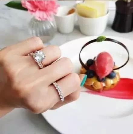如果你的手指比较有肉感,一定要选择钻石大的,尽量避免较小的钻石戒指,这样才会协调好看,因为在戒指的任何一侧露出太多的皮肤都会更加凸显手指的宽度。 相反,一颗Size较大的圆形钻石或钻石搭配中等到较宽的戒圈,不仅吸睛,而且非常显瘦。 不对称和棱角分明的形状,如祖母绿形切割钻石订婚戒指,也有助于营造出更为纤细的视觉效果。也可以选择镶嵌地比较高的戒指,把钻石托起来,这样看着会比较立体,显得手指瘦。其实手指粗胖的手是富贵手,戴的钻石都比别人大,有福气!