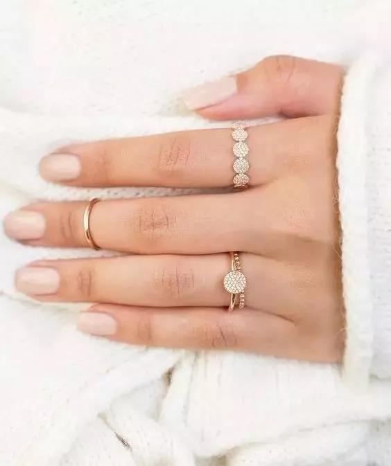 都是金色的戒指相互搭配,但是选择了比较有设计感的戒指,看上去更加时尚个性。