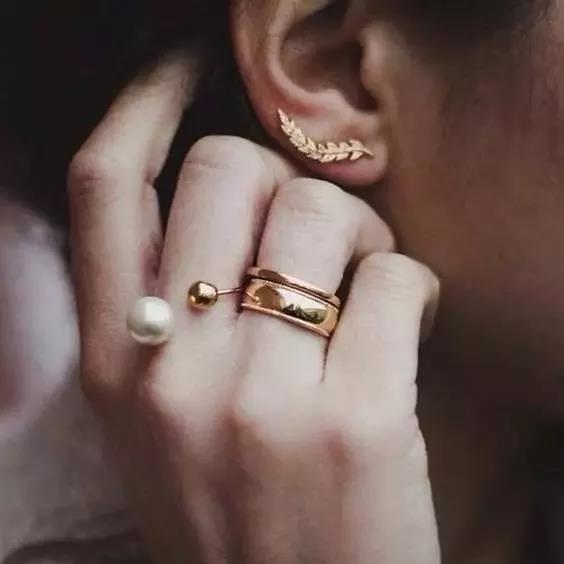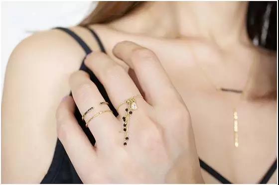 这属于入门级的叠戴法则,就是用同色系的戒指进行叠戴,如果觉得无聊,可以考虑在戒指款式上进行突破,用一两个款式比较独特的戒指进行叠戴,可以打破这种无聊感。粗细度不同或是造型不同的戒指,统一成金色调很有存在感。