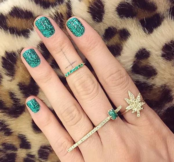 绿色在各类宝石中也相当主流,如图选择有亮片效果的甲油简直和珠宝的闪耀一脉相承,美得很高级感。