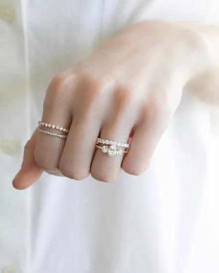 低调简约的款式非常适合初戴者,纤细的圆环多个叠戴能够拉长手指线条打造纤细手指。平行佩戴时,在食指、中指和无名指上戴1~3枚,保持戒指的位置平行,尾戒可以进行选择性佩戴。凹凸佩戴时要营造出两短一长的错落感,佩戴在骨节位置上拉长整体的比例。