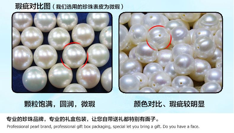 瑕疵——没有瑕疵的珍珠极其稀有,非常昂贵,一般珍珠都带有很小的瑕疵,并不影响美观。通常来讲,品质优秀的珍珠拥有极为润泽光亮的皮表,珍珠表层带有少于10%局部或者轻微的瑕疵;品质良好的珍珠表层带有三分之一的局部或者轻微的瑕疵;品质一般的珍珠则带有少于三分之二的局部瑕疵;品质粗劣的珍珠光泽暗淡,拥有少量严重的瑕疵,珍珠表面带有超过三分之二轻微的局部瑕疵。