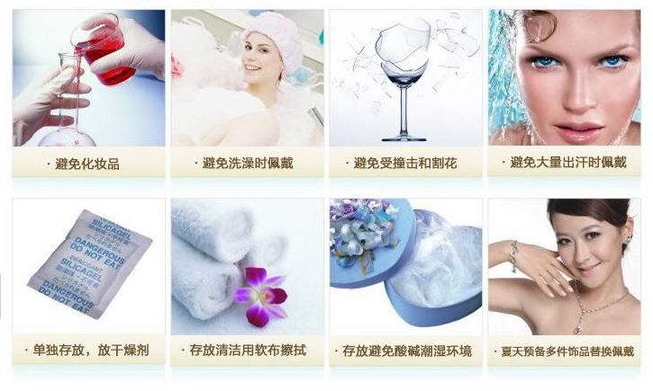 此类宝石对汗水和化妆品都比较敏感,故不宜直接接触,用后应用半湿软布抹干净。
