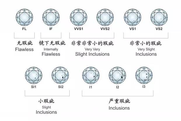 美国珠宝学院在检视钻石时,会使用10倍放大镜和依据G.I.A.「美国宝石学会」的标准来鉴定钻石净度的11个等级。从完美无瑕(FL)开始,即指钻石内在和表面均无瑕疵,然后顺序到最低的瑕疵级(I3),形容单以肉眼已能发现石内的内含物与瑕疵。