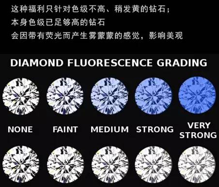 荧光级分别为中或强级,可以使D-F级别无色的钻石表面在一定的距离上看起来更加白,从而给钻石增加了一层朦胧之感或者油滑之感。所以具有中级或强级荧光的钻石价位要比其他钻石价格低。不过如果是G到K色的钻石,中等蓝或强蓝荧光还会让钻石看起来更白更漂亮。